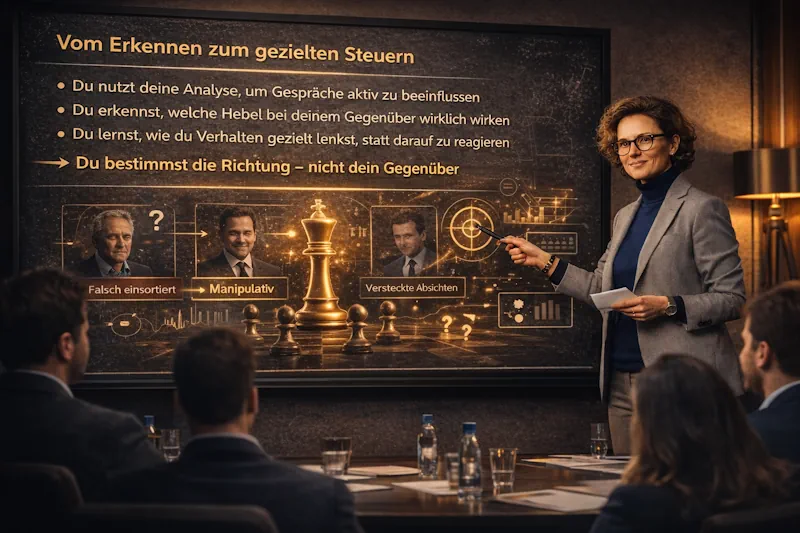 Du gewinnst die Fähigkeit, Gespräche nicht mehr dem Zufall zu überlassen, sondern sie bewusst zu lesen, zu steuern und kontrolliert zum gewünschten Ergebnis zu führen.