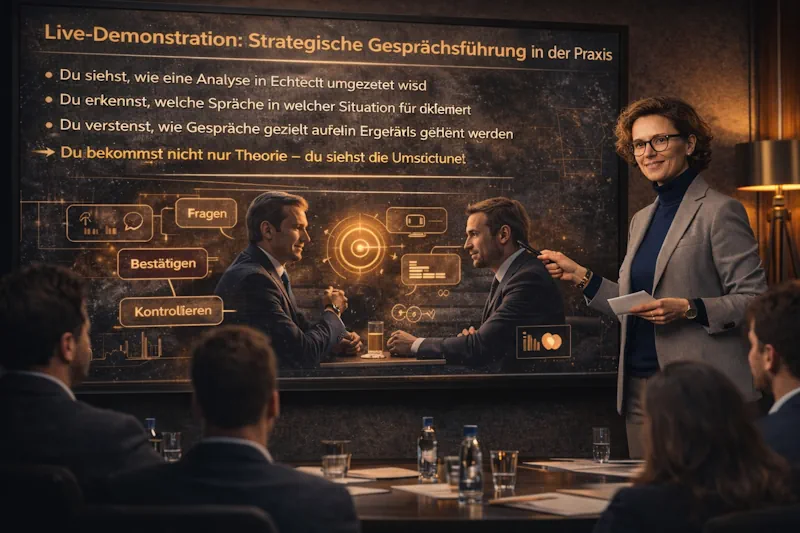 Genau hier liegt der Unterschied: Du lernst nicht, was du sagen sollst, sondern was wirklich passiert, wie du sprichst. Gespräche verlaufen scheinbar gut und kippen trotzdem an entscheidenden Punkten. Du erkennst Muster, Dynamiken und Signale in Echtzeit und kannst gezielt darauf reagieren. Du gehst nicht mehr aus Gesprächen heraus und fragst dich, was passiert ist — sondern bestimmst selbst, wie sie verlaufen.